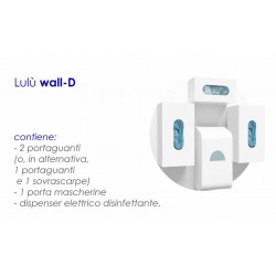 Kit di protezione Lulù wall-D : - 2 portaguanti (o, in alternativa, 1 portaguanti e 1 sovrascarpe) - 1 porta mascherine - 1 dispenser elettrico disinfettante "Decreto Rilancio"
